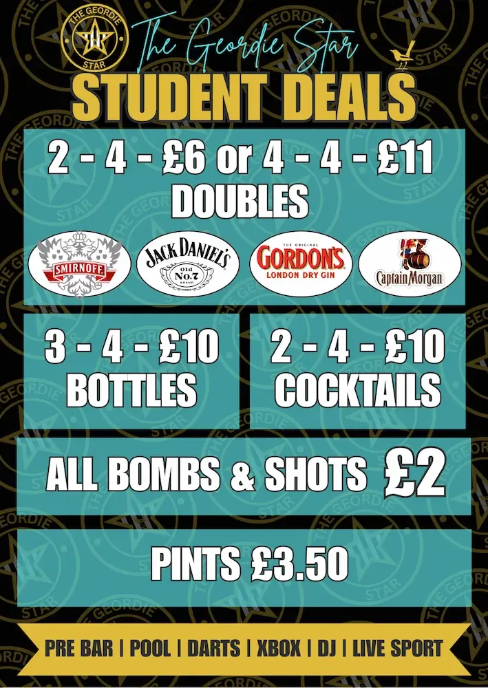 Yes. We offer some of the strongest student deals Newcastle has, including doubles from £6, cocktails 2 for £10, bottles 3 for £10, £2 bombs and shots, and pints for £3.50.